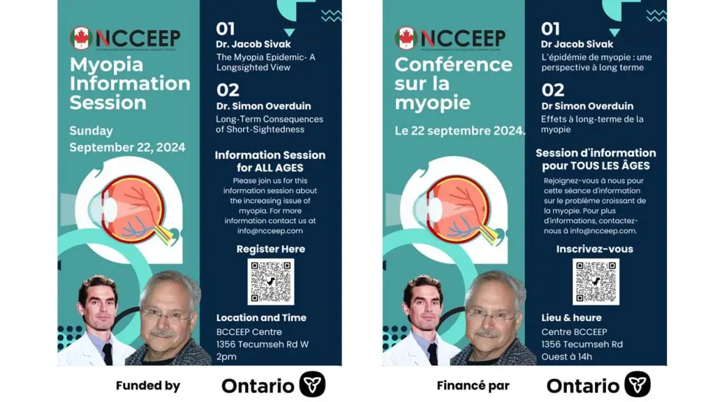 Le dimanche 22 septembre, nous organiserons une séance d’information sur la myopie. Deux conférenciers invités, le Dr Jake Sivak et le Dr Simon Overduin, aborderont différents sujets tels que les causes de la myopie et les effets à long terme qui en découlent. Les personnes de tout âge sont les bienvenus et nous encourageons les familles à s’inscrire. Si vous avez des questions, n’hésitez pas à nous écrire à info@ncceep.com.