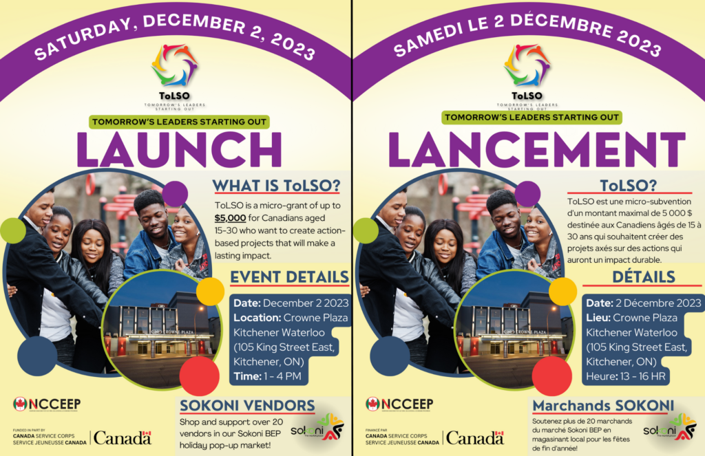 Pour en savoir plus sur ToLSO et comment postuler, rejoignez-nous pour l'événement de lancement le 2 décembre de 13 h à 16 h à l'hôtel Crowne Plaza Kitchener-Waterloo. Vous pourrez entendre des conférenciers inspirants, réseauter avec d'autres jeunes acteurs du changement et obtenir toutes les informations dont vous avez besoin pour démarrer votre parcours ToLSO. Ne manquez pas cette occasion de concrétiser vos idées !